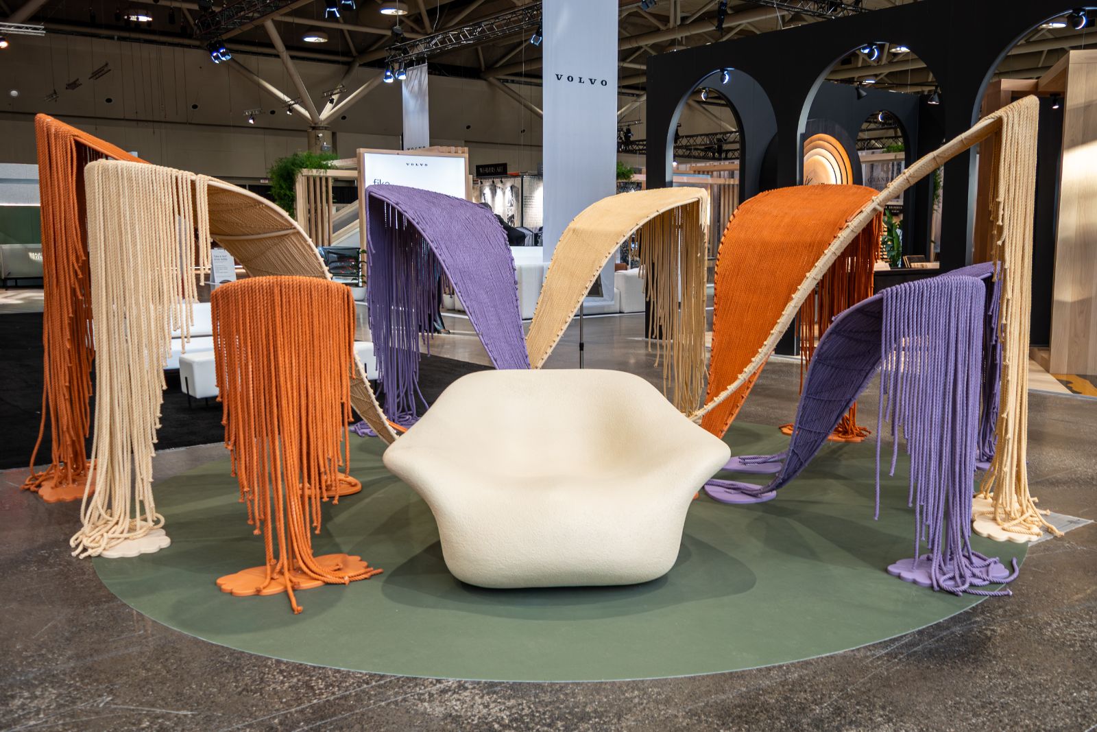 Complementing this core are the Embrace of the Dune armchairs, designed by Yury Goncharov and positioned beneath the thread structures. Their dune-inspired forms evoke natural landscapes shaped by time and interaction. These seating elements function as intimate shelters — temporary zones for reflection, dialogue, and emotional presence within the larger social field.