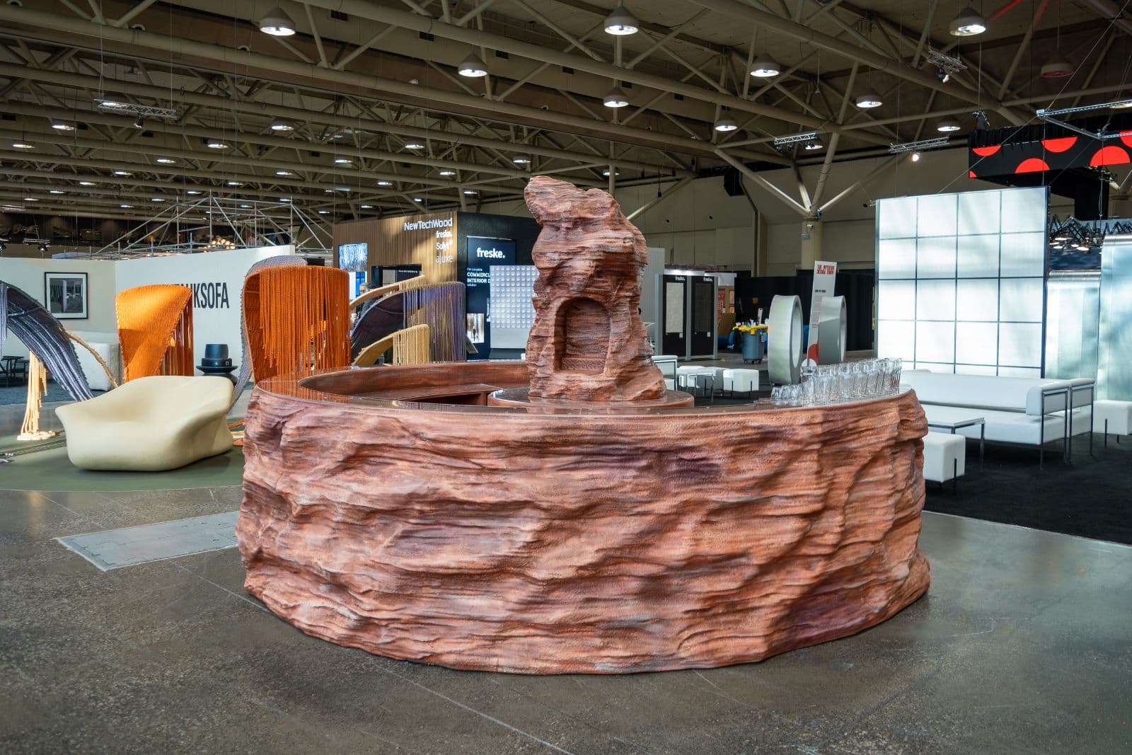At the center of the installation stands a sculptural, rock-like bar — conceived as a point of grounding within an otherwise fluid system. This “social anchor” becomes a place of pause, conversation, and exchange, where individual trajectories intersect and collective experience emerges.
