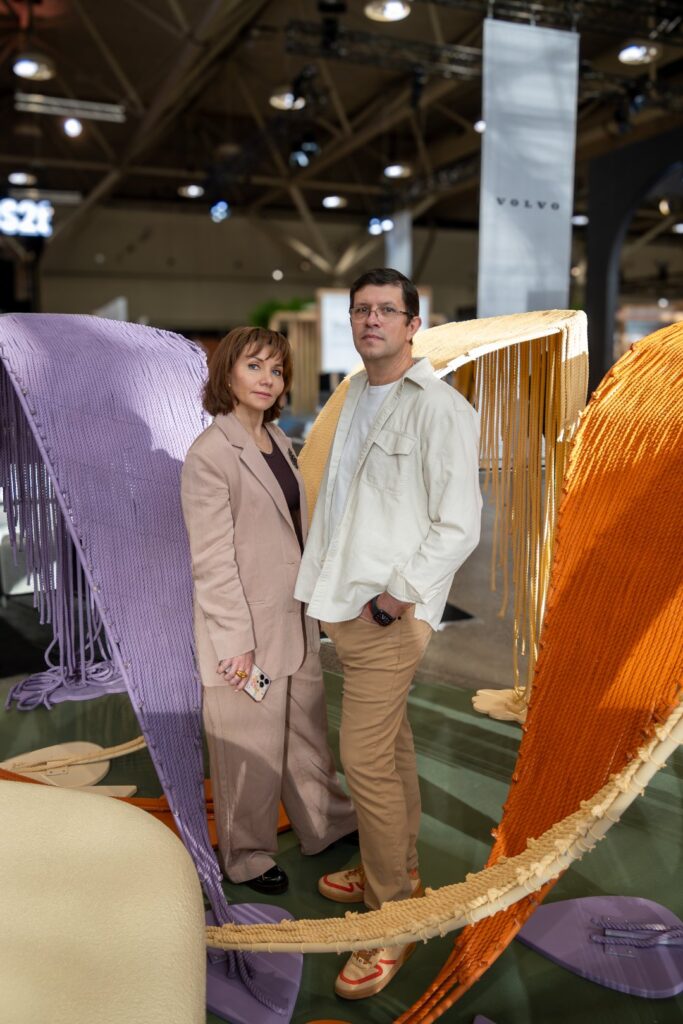 Complementing this core are the Embrace of the Dune armchairs, designed by Yury Goncharov and positioned beneath the thread structures. Their dune-inspired forms evoke natural landscapes shaped by time and interaction. These seating elements function as intimate shelters — temporary zones for reflection, dialogue, and emotional presence within the larger social field.