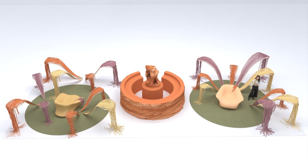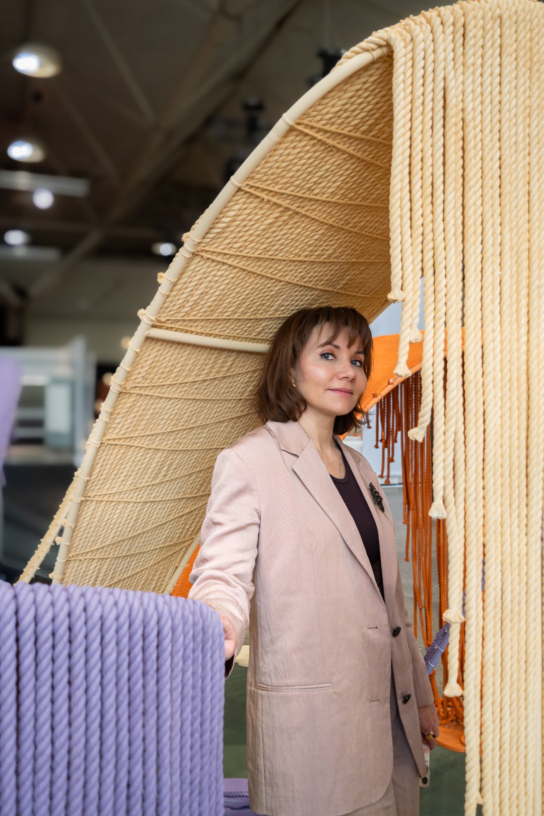 Complementing this core are the Embrace of the Dune armchairs, designed by Yury Goncharov and positioned beneath the thread structures. Their dune-inspired forms evoke natural landscapes shaped by time and interaction. These seating elements function as intimate shelters — temporary zones for reflection, dialogue, and emotional presence within the larger social field.